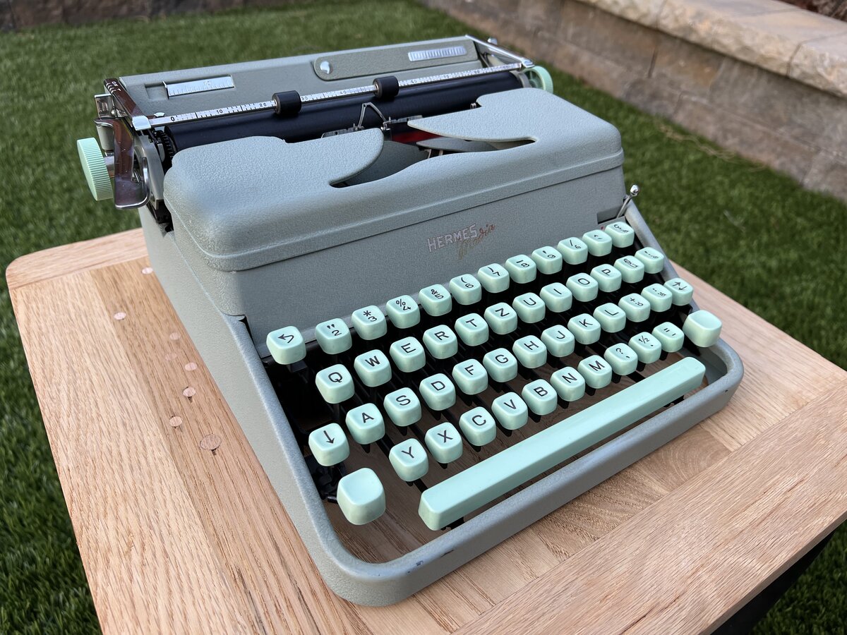 1943 - This military green Hermes Media with Swiss-German QWERTZ keyboard came in a metal military case. It looks great after refurbishing.1946 - This shiny black Hermes Media with Swiss-German QWERTZ keyboard looks stunning after refurbishing. It has a new platen and types really well.1949 - This Hermes Baby with Swiss-German QWERTZ keyboard has been refurbished and is one of my best-looking portables, in part thanks to the new red felt.1951 - This is an early Hermes Ambassador with US QWERTY keyboard. It is refurbished, has a new platen, and types quite well. The black keys look like they don't fit, but I have seen a few instances of Ambassadors with this key treatment.1951 - This is the younger sibling of the 1949 Hermes Baby with Swiss-German QWERTZ keyboard. This machine has also been refurbished with red felt.1954 - This Ruf-branded machine is similar to the Hermes 2000, but with special m2 and m3 keys. It features a Swiss-German QWERTZ keyboard. This machine still needs refurbishing.1955 - Hermes 2000 with Swiss-German QWERTZ keyboard in dark gray. This machine still needs refurbishing.195x - Hermes Media 2000 with Swiss-German QWERTZ keyboard in Gray. This machine still needs refurbishing.1958 - I bought Hermes Media in very pale green with Swiss-German QWERTZ keyboard for a song, and it turns out to be an amazing machine after refurbishing. It has a new platen.1961 - Hermes Baby with Swiss-French QWERTZ keyboard. This machine has been refurbished.1962 - Hermes 3000 "curvy" with Swiss-German QWERTZ keyboard. This machine is in beautiful condition.1963 - Hermes 3000 "curvy" with US QWERTY keyboard. I fixed this machine, and it now works quite well.1964 - Media 3 "curvy" with Swiss-German QWERTZ keyboard. This machine still needs refurbishing.1967 - Media 3 "boxy" with Swiss-German QWERTZ keyboard. This machine still needs refurbishing.1967 - Hermes 3000 "boxy" with Swiss-German QWERTZ keyboard. This machine still needs refurbishing.1970 - This is a beautiful "boxy" Hermes 3000 with US QWERTY keyboard. This is one of my favorite typers, and it prints beautifully on the page.1971 - This white plastic Hermes Baby with Swiss-German QWERTZ keyboard is not as sturdy as the earlier metal-bodied ones, but I think that it still looks beautiful after refurbishing. Like with my earlier Babys, I used the red felt treatment.1971 - This plastic-bodied third-generation Hermes with Swiss-German QWERTZ keyboard looks and types beautifully after reconditioning. You might think that these later machines are poor cousins of the earlier 3000, but I love this one.1976 - This is a very late Hermes Ambassador with Swiss-German QWERTZ keyboard, and it came in a military crate. The machine looks great, but the basket is entirely frozen.1976? - This is an uncommon Hermes 808 electric typewriter with US QUERTY keyboard. It works using a single-element, like the IBM Selectric. This machine needs fixing and refurbishing.